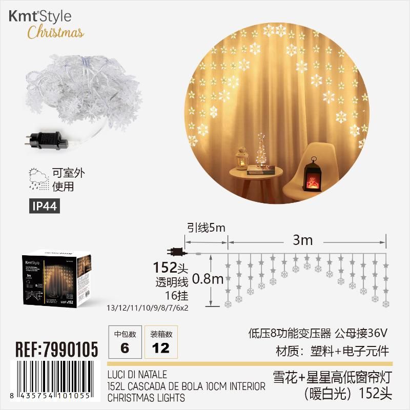 LUZ DE CORTINA PARA INTERIOR Y EXTERIOR DE COPO DE NIEVE Y ESTRELLA DE 3M DE ANCHO Y 0.8M DE CAÍDA. MAS 5M DE CABLE, FUNCIONAMIENTO DE ENCHUFE.